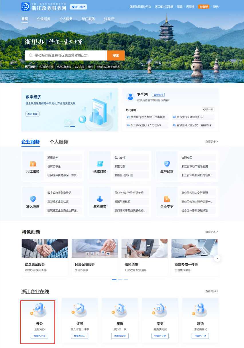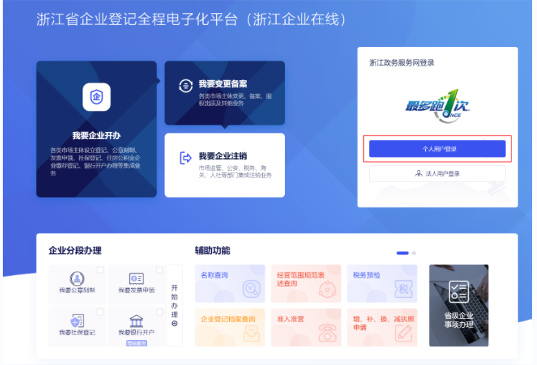登录入口:使用电脑打开浙江政务服务网,在首页模块,通过主题集成服务找到企业登记全程电子化登记平台,点击我要办企业进入全程电子登记平台。