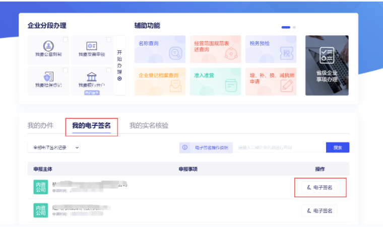 登入浙江省企业登记全程电子化登记平台,选择【我的电子签名】--【待签名】--【电子签名】。