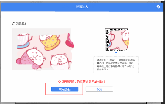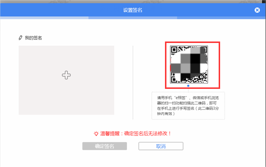 用手机“e照签”、微信或手机浏览器的扫一扫功能扫描二维码,即可在手机上进行手写签名。二维码3分钟内有效。