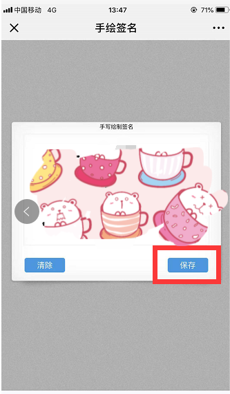手机上手绘签名并【保存】,如签写错误,可点击【清除】,重新手绘签名,签名完成之后点击【确定签名】,完成电子签名。注意:登录谁的账号,签谁的名字。